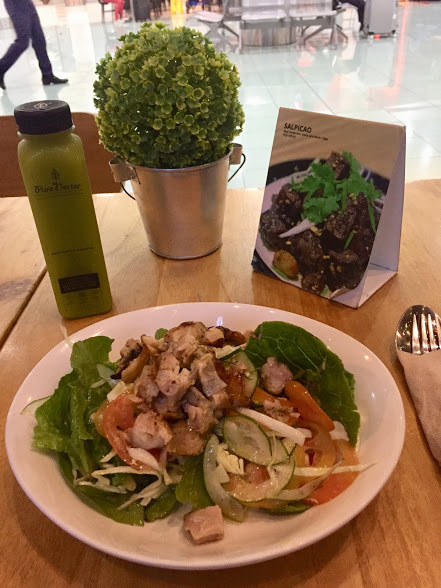 I got a Restore & Renew cold-pressed juice made from orange, lemon, ginger, tumeric, celery, basil, etc. (190P) which was very nice. Their chicken salad was good too.