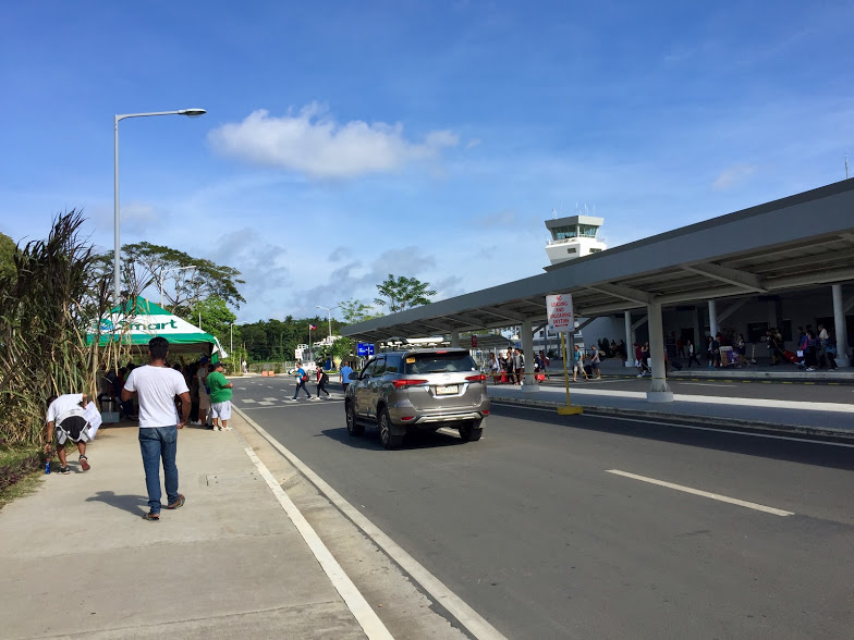 Puerto Princesa Airport arrival gate (on the right) with lots of van/bus ticket booths (near the gate and on the other side where the green tent is)