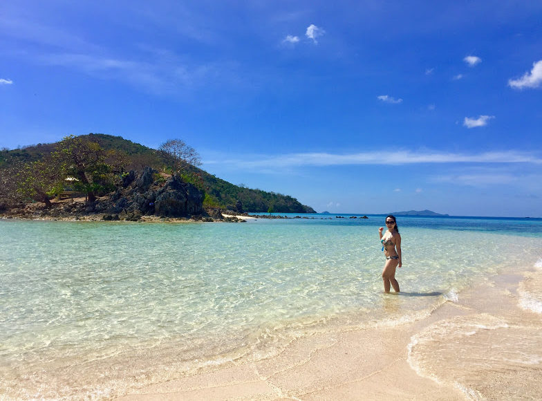 Điểm dừng chân đầu tiên trong ngày. Nơi đây được ví như Maldives của Philippines vì buổi sáng khi thủy triều xuống sẽ có một con đường cát hiện lên ngăn ở giữa, cộng thêm màu nước xanh ngọc đặc trưng như ở Maldives.